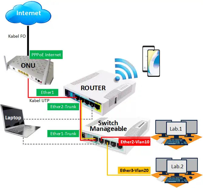 Dalam kasus ini kita akan merancang bangun dan mengkonfigurasi jaringan sesuai dengan topologi diatas. Secara umum router akan berfungsi sebagai Gateway Internet, Wireless Access Point (WAP), DHCP server, dan Vlan. Sedangkan Switch Manageable akan melewatkan Vlan ke Lab.1 dan Lab.2