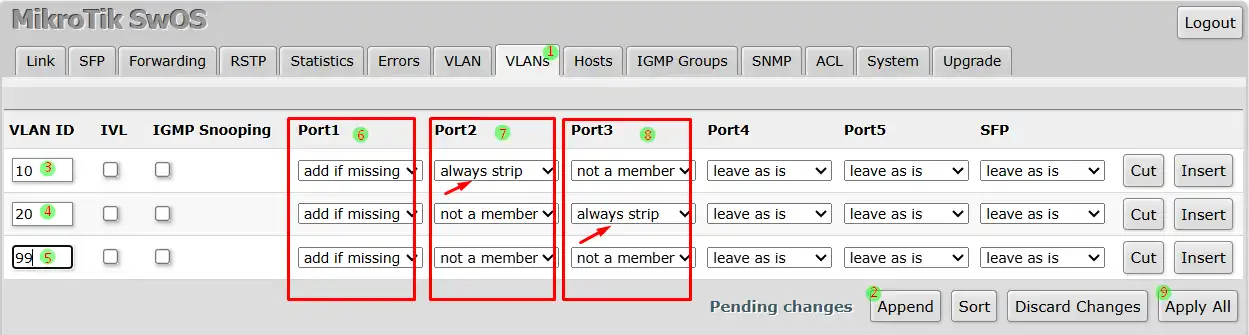 2. Klik tombol Append sebanyak 3 kali untuk membuat Vlan10, Vlan20 dan Vlan99