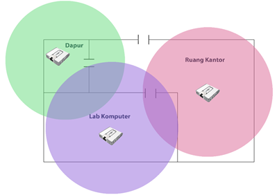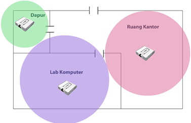 Sebagai contoh sederhana, terdapat 3 akses point dengan channel yang sama pada sebuah ruangan, dan kita lihat frekuensi pada ruangan tersebut saling bersinggungan.