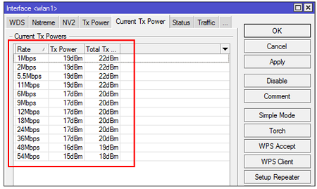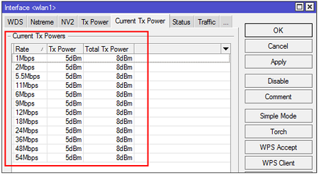 Setelah konfigurasi diatas, kita bisa melakukan pengecekan kembali pada Tab ‘Current TX Power’. Hasilnya adalah pada setiap data-rate akan digunakan TX-Power wireless yang sama.